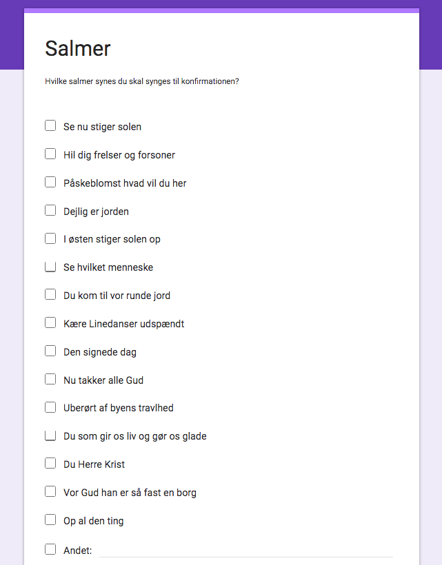 Med google analyse - klik her - kan man, hvis man har en google konto, hurtigt lave en undersøgelse f.eks. om hvilke salmer konfirmanderne vil foretrække til konfirmationen og udsende via mail.