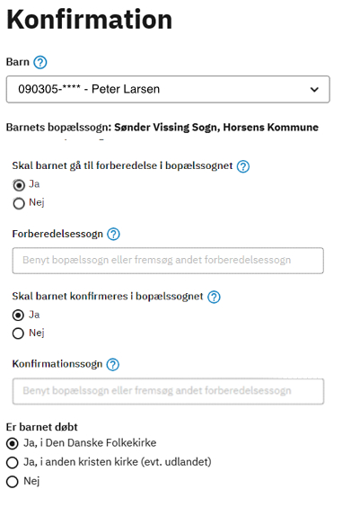 De børn, man har forældremyndighed over, vil findes i første felt, og man kan vælge det barn, der aktuelt står foran en konfirmationsforberedelse. Det vil fremgå, hvilket sogn man er bosiddende i.