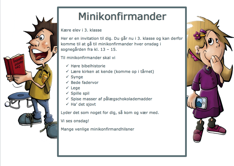 Det er bedst at have dem så tidligt som muligt på dagen, så de ikke er for trætte. Ofte vil skolen også vide noget om der er en bestemt dag, hvor de fleste f. eks. går til spejder eller gymnastik. De dage bør undgås. Med invitationen følger også et brev til forældrene, for det er langtfra alle, der er klar over, hvad ”minikonfirmander” er.