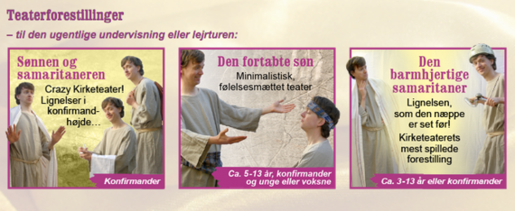 - Teaterforestilling: Som indslag i den daglige undervisning – eller til en lejrtur, konfirmandklub eller konfirmandaften med forældre. Kan spilles for såvel én som mange konfirmandklasser.