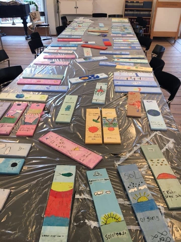 Ginette arbejder med forskellige metoder og i forskellige materialer, som rammer den alder, hun laver kunst med. Hun har desuden selv udviklet arbejdsmetoder, som både er enkle og sjove at arbejde med, og som giver meget flotte resultater. Det er nemlig vigtigt for os ved kirken, at resultatet er flot, så børn og unge har lyst til at have deres egen kunst hængende bagefter.