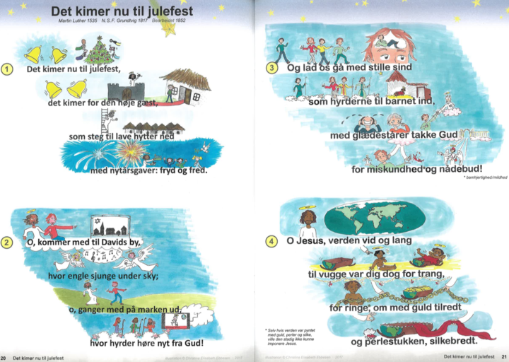 Hæftet er 50 sider, indeholder 15 salmer og sange illustreret med 90 farvede tegninger og koster 50 kr.